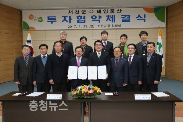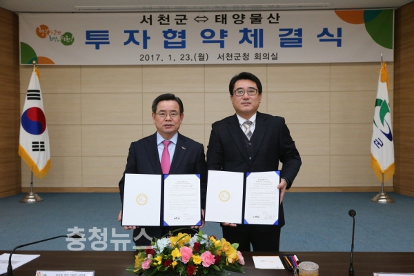 충남 서천군노박래군수는 23일 서천군청 회의실에서 노박래 서천군수, 김재곤 태양물산(주) 대표를 비롯한 관계공무원 등이 참석한 가운데 태양물산(주)의 투자와 서천군의 행정적 지원 등 기본적 이해사항에 관한 협약을 체결했다고 밝혔다.