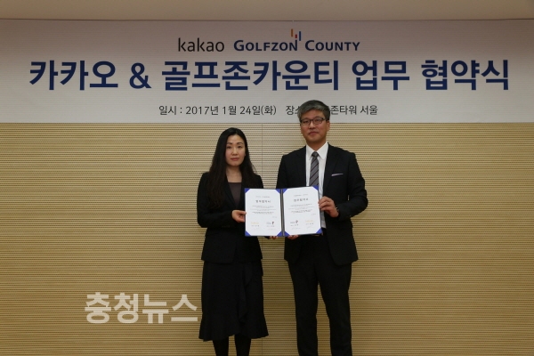 골프장 토털서비스기업 ㈜골프존카운티 김준환대표 와 ㈜카카오 임지훈대표가 '골프 서비스 제공을 위한 업무협약'을 체결했다.