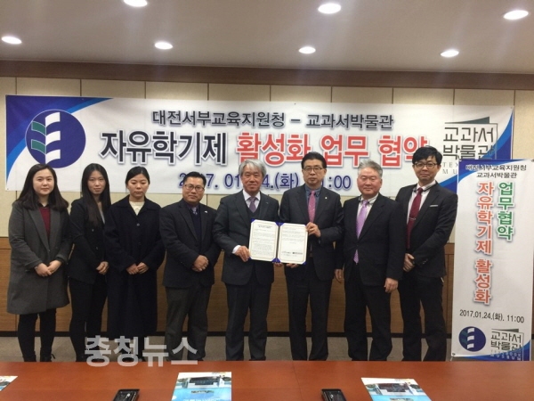 대전서부교육지원청 김동문교육장은 1월 24일 자유학기제 및 진로진학교육 유관기관과의 인적․물적 자원 공유를 통해 실질적 협력관계를 구축하고, 학생의 성장과 지역사회 발전을 도모하기 위해 교과서박물관 문중근관장과 업무협약을 체결했다고 밝혔다.