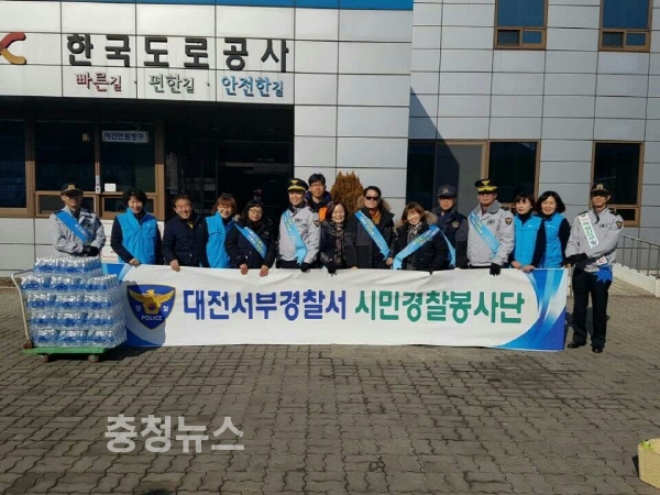 대전서부경찰서 생활안전계이철희경감은 26일 한국도로공사 서대전 나들목에서 경찰관, 시민명예경찰 등 20여명이 참석한 가운데 안전하고 편안한 설 연휴가 되도록 4대 사회악 근절・범죄예방·교통안전 캠페인을 실시하였다.