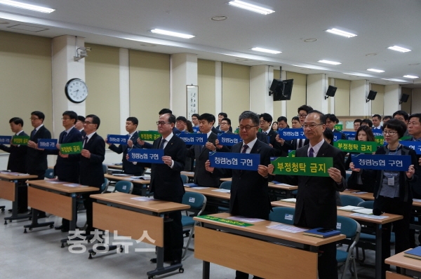 이날 결의대회에는 농협은행 충남영업본부, 농협생명 충남총국, 농협손해 충남총국, 충남검사국 등 충남농협 계열사 전 임직원 100여명이 참석하였으며 충남농협 임직원들은 청탁금지법 등 법령과 제규정을 준수하고, 공정한 업무처리로 부정·부패 근절에 앞장서기로 다짐했다.
