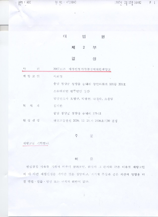 지난해 실시된 5.31지방선거와 관련 공직선거법위반으로 고발돼 진행된 이번 재판은 2006년 12월21일 대전고등법원으로부터 재정신청기각됨으로 무혐의 처리 된 결정에 대해 상대후보측이 이에 불복 대법원에 재항고를 함으로서 진행되어 왔다.