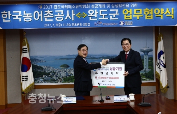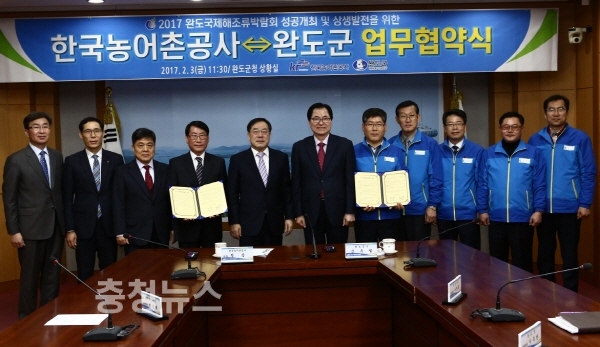 한국농어촌공사(사장 정승)와 완도군(군수 신우철)이 3일 전남 완도군 상황실에서 ‘2017완도국제해조류박람회’의 성공적 개최를 위해 업무협약(MOU)을 체결했다.