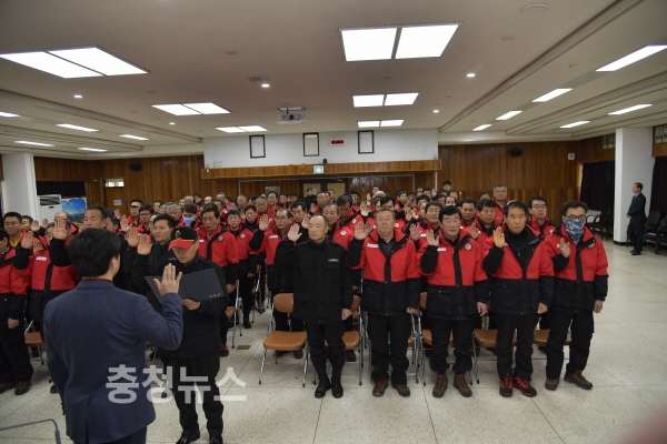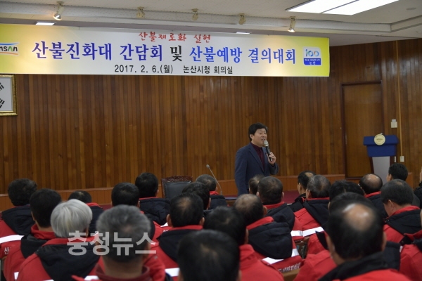충남 논산시 황명선시장은 6일 회의실에서 산불감시원, 산불전문예방진화대, 관계공무원 등 110여명이 참석한 가운데 산불예방 역량 강화를 위한 산불예방 결의대회를 가졌다.