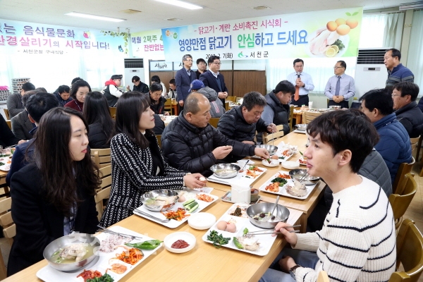 충남 서천군은 7일 점심시간을 활용해 군청 구내식당에서 노박래 서천군수를 비롯한 공무원 300명이 참석한 가운데 닭고기 소비촉진을 위한 ‘닭고기 및 계란 시식회’를 가졌다.
