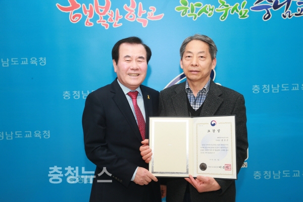 충남도교육청 김지철교육감은 안전한 학교 환경 조성을 위해 노력한 유공자로 문신근 전 해병대아산전우회장을 선정하고 7일 도교육청 집무실에서 부총리 겸 교육부장관 표창장을 수여했다.