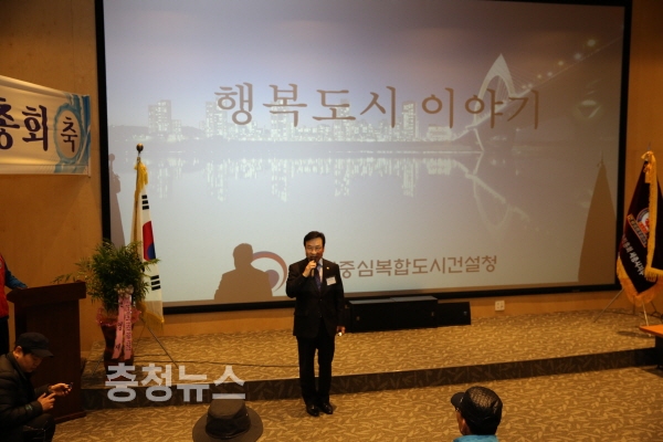 이충재 행복청장은 지난 12일 행복도시 홍보관(세종시세종리, 호수공원 인근)에서 사단법인 한국체육진흥회 회원 약 150명을 대상으로 행복도시 설명을 하고 있다.