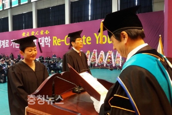 이 의원은 15일 아산 선문대학교 체육관에서 열린 졸업식에서 행정학 학사학위를 수여 받고, 공로상을 수상했다.