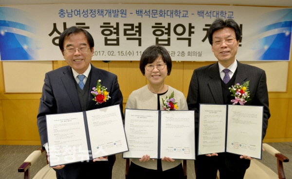 왼쪽부터 백석대학교 최갑종 총장, 충남여성정책개발원 안정선 원장, 백석문화대학교 송기신 부총장.