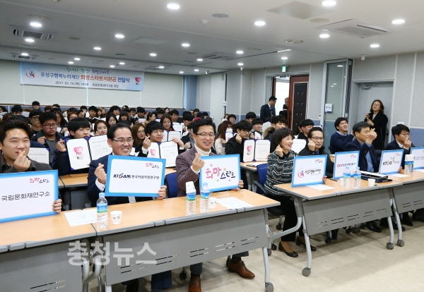 대전 유성구행복누리재단은 16일 죽동문화센터에서 허태정 유성구청장을 비롯한 후원기관 5기관과 유성구 저소득가정 고등학교 졸업생 94명이 참석한 가운데 희망스타트 지원금 전달식을 개최했다.