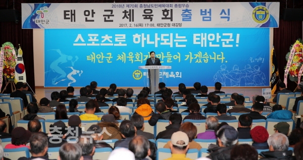한상기 태안군수와 군 체육회 종목별 단체장 등 250여 체육인이 참석한 가운데 열린 이날 출범식은 통합 추진 경과보고와 이사 임명장 수여, 종목단체 및 읍·면 체육회장 인준장 수여, 도민체전 종합우승 다짐 결의문 낭독 등의 순으로 진행됐다.