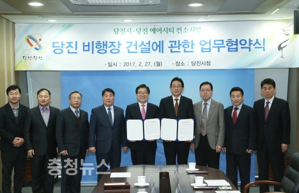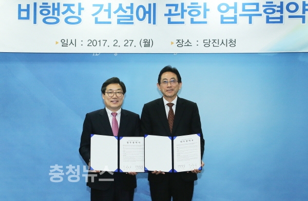 충남 김홍장 당진시장과 당진 에어시티 컨소시엄 김한용 대표는 27일 당진시청에서 민자개발 방식으로 추진하는 350억 원 규모의 당진 비행장 건설 관련 업무협약을 체결했다.