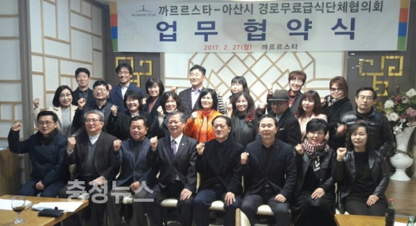 충남 아산시 경로무료급식단체협의회(회장 박태순)는 27일 까르르스타(대표 김경회)와 무료경로식당 자원봉사자 주차장 지원을 위한 업무협약을 체결했다.
