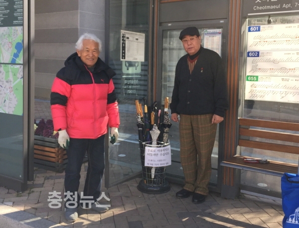 세종특별자치시 한솔동 첫마을 7단지 경로당이 갑작스런 눈·비로 미처 우산을 준비하지 못해 불편을 겪는 지역주민을 위해 우산을 무료로 대여해 주고 있다.