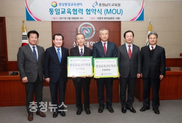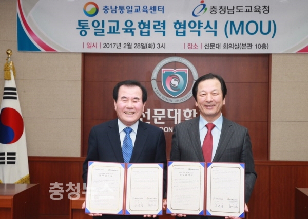 충남도교육청(교육감 김지철)과 충남통일교육센터(센터장 황선조 선문대 총장)는 28일 선문대학교 본관 회의실에서 통일교육 활성화를 위한 업무협약식을 가졌다.