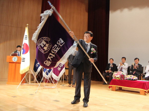 이승훈 신임 의료원장이 의료원기를 흔들고 있다.