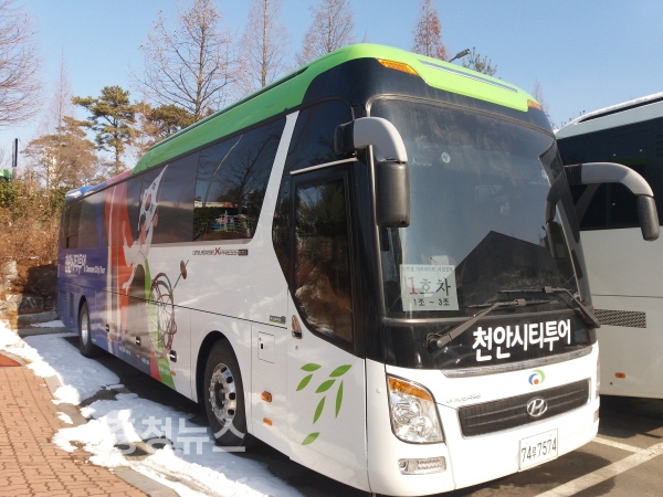 충남 천안의 주요관광지를 하루 코스로 둘러보는 천안시티투어가 ‘도솔투어’라는 새 이름으로 2일 첫 운행에 나섰다.