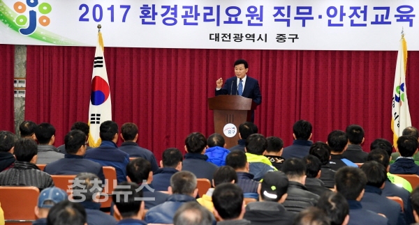대전 중구 박용갑 청장은 2일 구청 대회의실에서 환경관리요원 및 대형폐기물 수거원 등 119명이 참여한 가운데 ‘환경관리요원 직무·안전교육’을 실시했다.