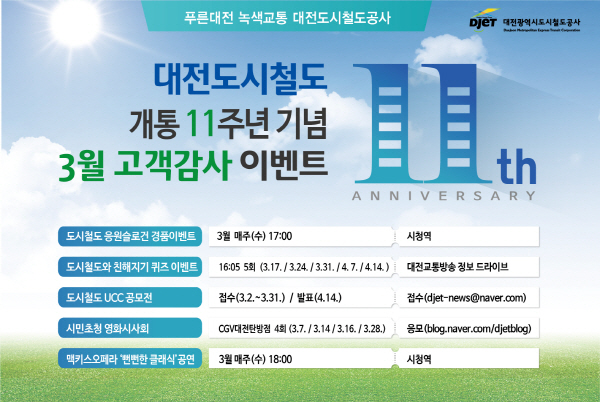 먼저 3월 8일부터 29일까지 매주 수요일 오후 5시 시청역에서 ‘도시철도 개통 11주년 응원슬로건 이벤트’와 17일부터 다음달 14일까지 매주 금요일 대전교통방송을 통해‘도시철도 친해지기 퀴즈 이벤트’를 개최하고 당첨자에게는 도시철도를 이용할 수 있는 그린카드를 경품으로 지급한다.