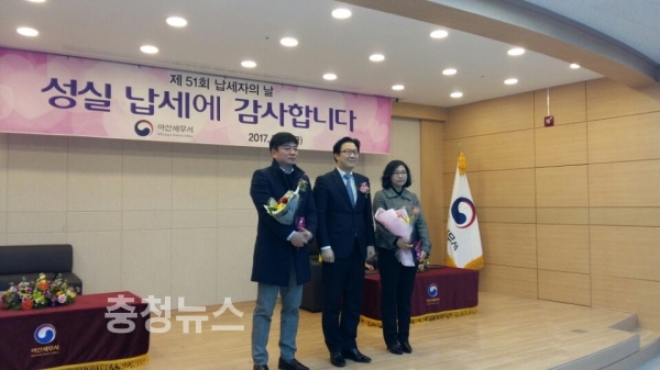 제51회 납세자의 날(3. 3)을 맞아 지난 3일 아산세무서 신재봉 서장으로부터 아산시(시장 복기왕) 민원봉사담당관실 이의진 주무관과 토지관리과 박민식 주무관이 감사장를 받았다.