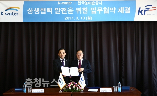 한국농어촌공사(사장 정승)와 K-water(사장 이학수)는 13일 경기 안산시 시화조력관리단에서 기후변화 대응 등 양 기관 간 협력강화를 위해 업무협약을 체결했다.