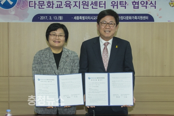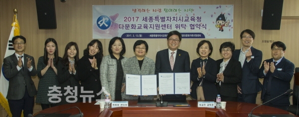 세종시교육청(교육감 최교진)은 13일 세종시건강가정다문화가족지원센터(센터장 하미용)와 「세종시교육청 다문화교육지원센터」 업무위탁 협약식을 맺고 다문화교육진흥을 위한 촘촘한 지원체계를 구축하기로 했다.