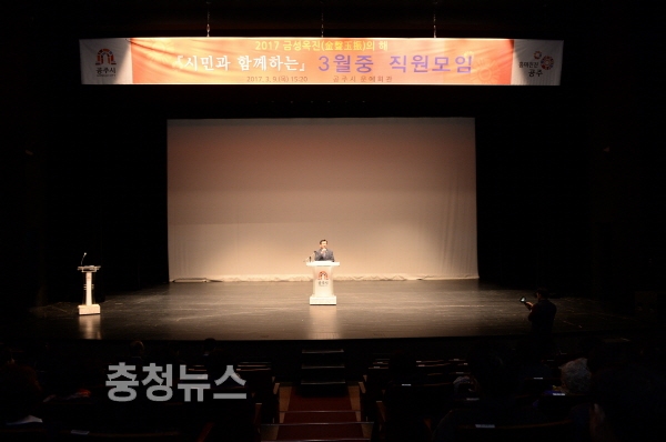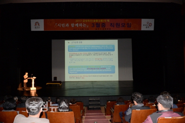 충남 공주시 오시덕 시장은 주요시정의 방향을 시민과 공유하고 직원과 시민 간 공감의 장을 마련하고자 지난 9일 문예회관에서 오시덕 시장을 비롯한 시민과 시청 직원 등 600여명이 참석한 가운데 ‘3월중 시민과 함께하는 직원모임’을 개최했다.