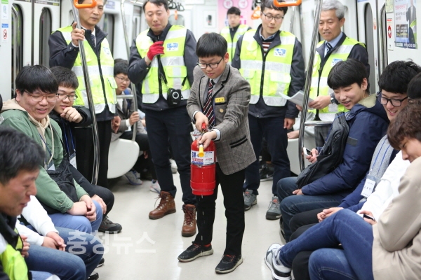 특별 편성한 운행열차에서 출입문 비상개방, 화재진압 등 직접 체험