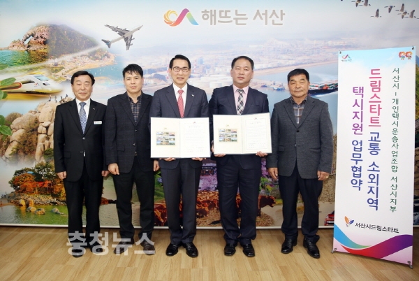 충남 서산시는 15일 시장실에서 충남 개인택시 운송사업조합 서산시지부와 드림스타트 가정에 택시 등 차량을 지원하기 위한 업무협약을 맺었다.