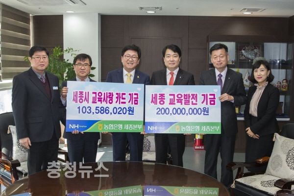 세종특별자치시교육청(교육감 최교진)은 NH농협은행 세종영업본부(본부장 김태훈)으로부터 15일 교육금고 협력사업비와 세종교육사랑카드 기금 3억 3백만원을 전달받았다고 밝혔다.