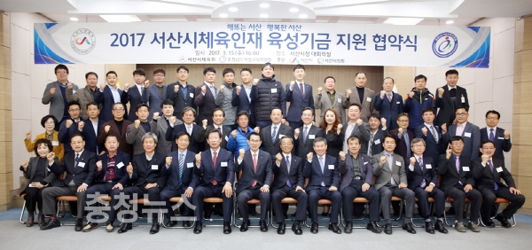 충남 서산시는 15일 서산시청 대회의실에서 시체육회와 경기단체 임원, 교육지원청 관계자 등 80명이 참석한 가운데 체육인재 육성 협약 및 기금 전달식을 열었다.