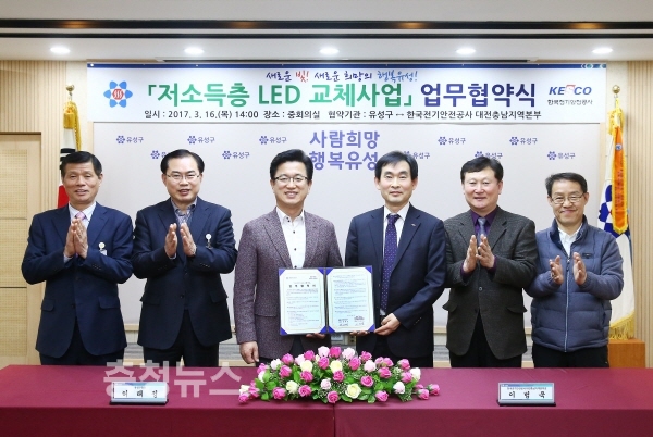 대전 유성구(구청장 허태정)가 16일 구청 중회의실에서『저소득층 LED 교체사업』 추진을 위해 한국전기안전공사대전충남지역본부(본부장 이범욱)와 업무협약을 체결했다고 밝혔다.