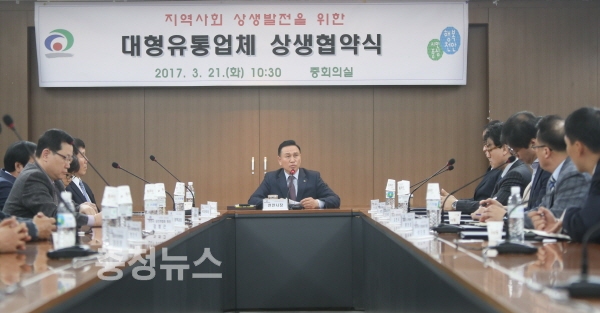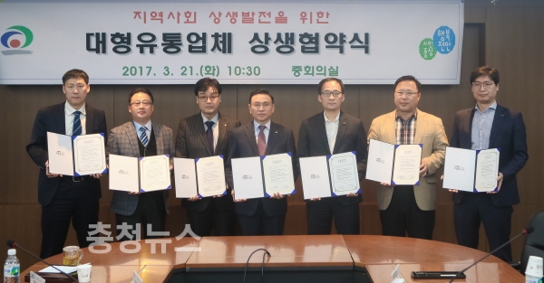 충남 천안시는 21일 시청 중회의실에서 구본영 시장, 대형 유통업체 대표, 천안시 상인연합회장, 천안시 슈퍼마켓협동조합장, 나들가게협의회장 등 20명이 참석한 가운데 지역기여 및 상생발전을 위한 ‘대형유통업체 상생협약(MOU)’을 체결했다고 밝혔다.