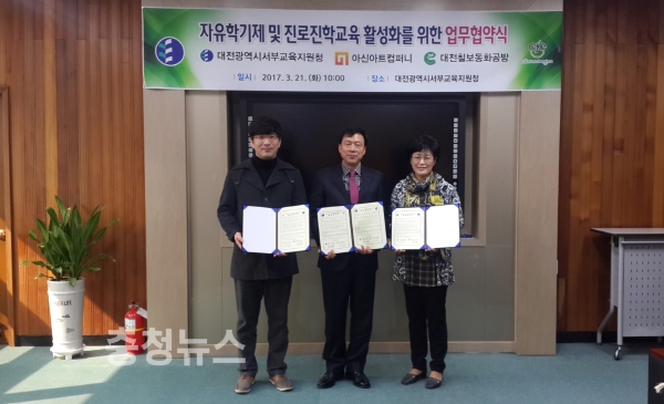 대전서부교육지원청(교육장 김동문)은 21일 아신아트컴퍼니(대표 이인복), 대전칠보동화공방(대표 홍인순)과 ‘자유학기제 및 진로진학교육 활성화를 위한 업무협약’을 체결했다.