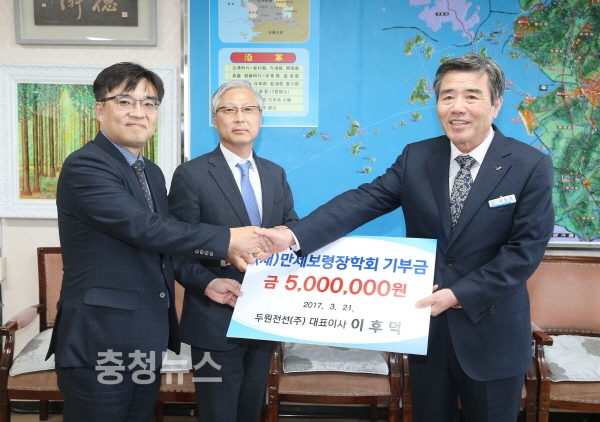 충남 보령시는 지난 21일 오후 시장실에서 김동일 시장과 서울전선(주) 이장열, 두원전선(주) 이후덕 대표가 참석한 가운데 지역 인재 양성을 위한 장학금 500만 원을 (재)만세보령장학회로 기탁했다고 밝혔다.