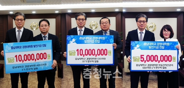 충남대 경영대학원 최고위과정인 Healthtainment CEO과정(이하 HCEO과정), 경영대학원 최고경영자과정, 부동산자산관리 CEO과정 원우회는 23일 오전 11시, 오덕성 총장을 방문해 경영대학원 발전기금으로 총2,500만원을 기부했다.