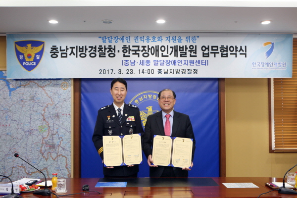 충남경찰청(청장 김재원)은 23일 충남경찰청 중회의실에서 한국장애인개발원(원장 황화성)-충청남도·세종특별자치시 발달장애인지원센터와 발달 장애인 권익 옹호와 지원을 위한 업무 협약을 체결했다고 밝혔다.
