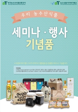 한국농수산식품유통공사(사장 여인홍) 농수산물사이버거래소(소장 황형연)는 각종 행사 및 세미나 개최 시 활용도가 높은 우리 농식품 기념품 온라인 전문 몰을 오픈 하였다.