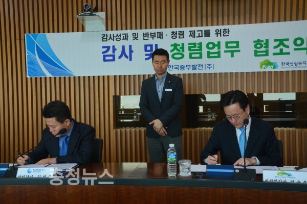 한국산림복지진흥원(원장 윤영균)은 23일 한국중부발전(주)(사장 정창길)과 충남 보령시 한국중부발전 회의실에서 ‘감사 및 청렴 협조를 위한 업무협약(MOU)을 체결했다고 밝혔다.