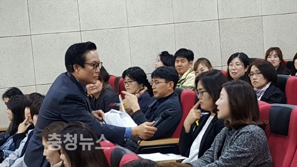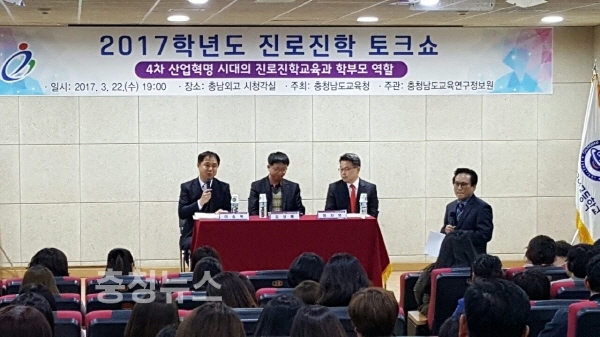 충남외고 진로진학 토크쇼에서는 ‘4차 산업혁명 시대의 진로진학교육과 학부모 역할’이라는 주제로 정명근 복자여고 진로진학상담교사의 발제와 김상배(공주고), 이승복(쌘뽈여고), 정지영(북일고) 등 패널과 학부모들의 쌍방향 토론이 2시간 동안 진행됐다.