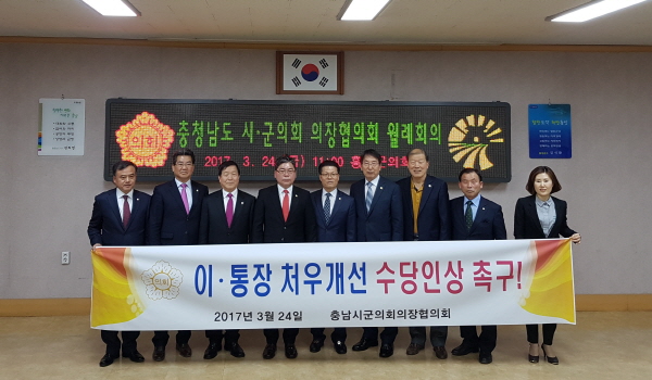 충남시군의장협의회(회장 이기성)가 24일 홍성군의회에서 열린 협의회 정례회에서 『이․통장 처우개선을 위한 수당 인상 건의안』을 채택했다.