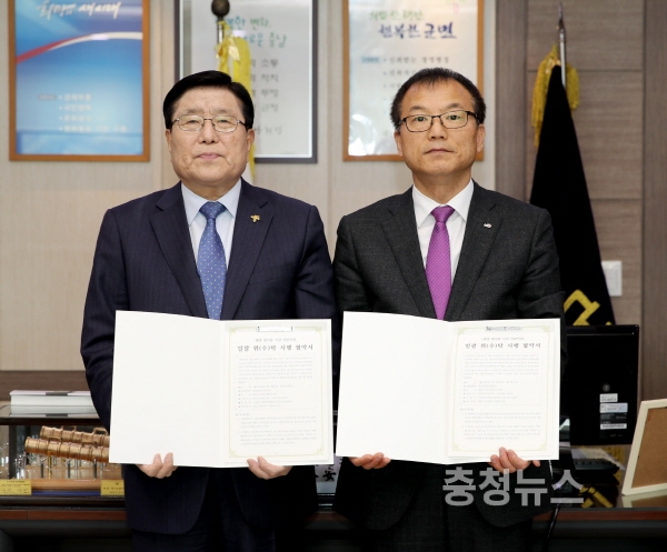 군은 24일 군청 군수실에서 한상기 군수와 한국농어촌공사 이현구 서산태안지사장 등이 참석한 가운데 ‘폐열재이용시설 지원 사업 위·수탁 협약식’을 갖고 태안화력 온배수 활용 시설원예단지 조성 사업의 힘찬 출발을 알렸다.