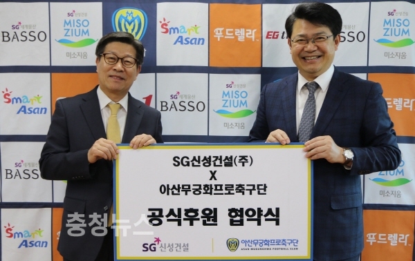 이 날 공식 후원 협약식에는 SG신성건설 이명근 대표이사, 아산무궁화프로축구단 복기왕 구단주 그리고 사무국 관계자가 참석한 가운데 진행됐다.