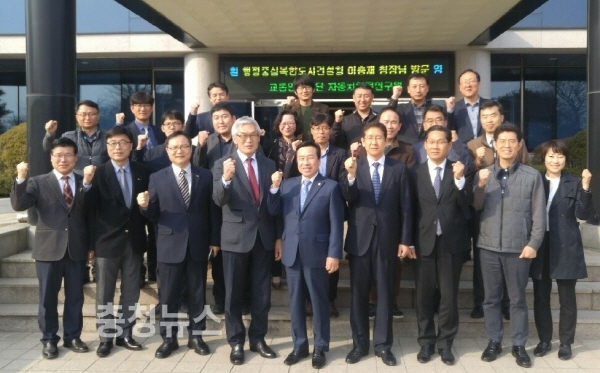 이충재 행복청장(앞줄 가운데)은 지난 24일 자동차안전연구원을 방문, 세계 최대 수준인 지능형교통시스템(ITS) 시험로 및 자율주행차 실험도시 K-City* 부지를 시찰하고 자율주행 고속주회로 5km를 시승하였다.
