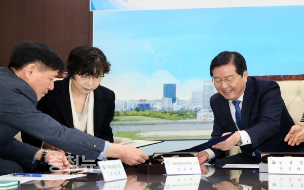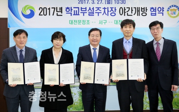 대전 서구 장종태 청장은 도심 주차난 해소를 위해, 2개 학교(문정초등학교, 구봉고등학교)와 27일 구청 다목적실에서 ‘학교부설주차장 야간개방 협약’을 체결했다고 밝혔다.
