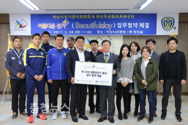 아산무궁화프로축구단은 28일 아산시선거관리위원회 1층 회의실에서 아산시선거관리위원회와 ‘아름다운 선거’ 업무 협약식을 가졌다.
