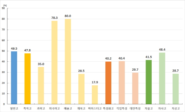 고등학교 중 가장 여학생 비율이 낮은 유형의 학교는 특성화고(40.2%)이며, 자율고(41.5%), 특수목적고(47.8%), 일반고(49.5%) 순으로 나타났다. 하지만 좀 더 자세히 살펴보면 특수목적고의 경우 예술고(80%)와 외국어고(78.3%)는 여학생 비율이 남학생 비율보다 높은 반면 과학고(35%), 체육고(28.5%), 마이스터고(17.9%)는 매우 낮아 특수목적고 간에도 그 특성에 따라 여학생 비율에 있어 상당한 차이를 보여준다.