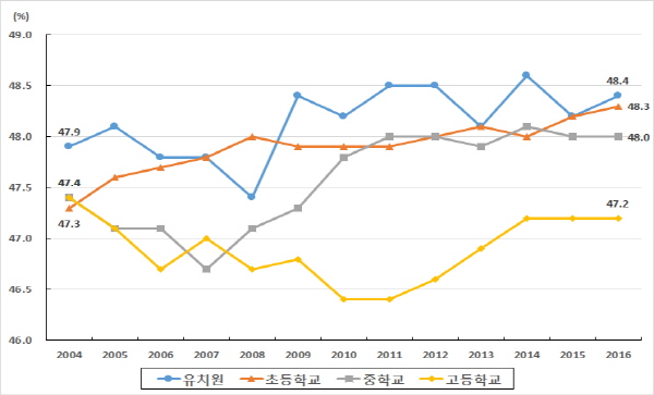 자료집에 따르면 2016년 여학생 비율은 2004년과 비교해 볼 때, 고등학교를 제외한 모든 학제에서 모두 증가했다. 2004년 47.3%였던 초등학교 여학생 비율은 매년 0.1%에서 0.3%정도의 작은 변화폭 안에서 증감을 반복하며 2016년에는 48.3%로 1%p 증가해 모든 학교급에서 가장 큰 증가율을 보였다. 반면 고등학교 여학생 비율은 2016년 47.2%로 2004년에 비해 0.2%p 감소했다.