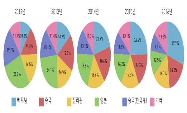 통계자료집_연도별 부모의 출신국가별 다문화 학생 비율(2012-2016)