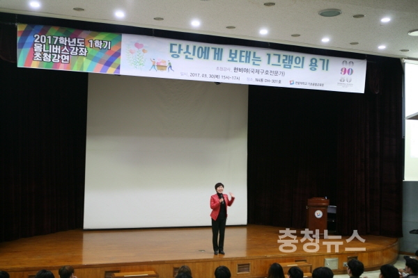 이번 특강은 학생과 교직원 300여명이 참여한 가운데 ‘당신에게 보태는 1그램의 용기’를 주제로 두 시간 가량 이어졌다.